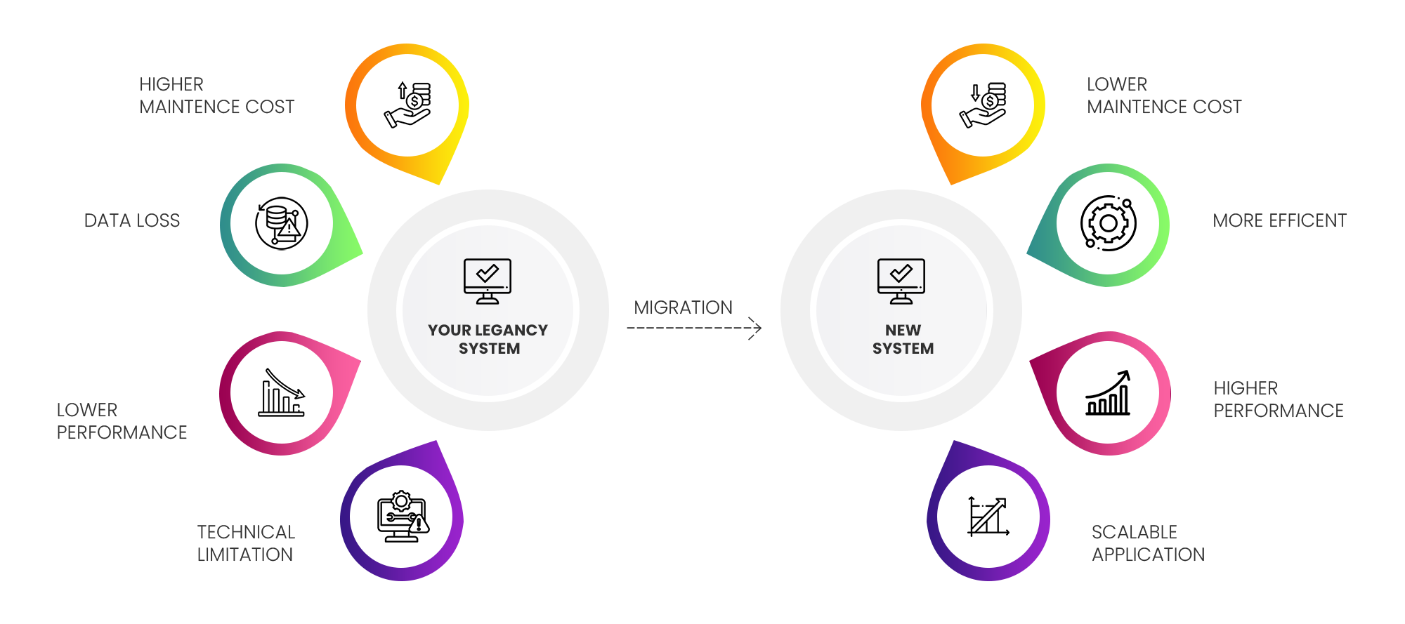 We not only offer legacy system migration services for your existing system, but also add value by reviewing and incorporating any changes required in the software to make it more efficient.